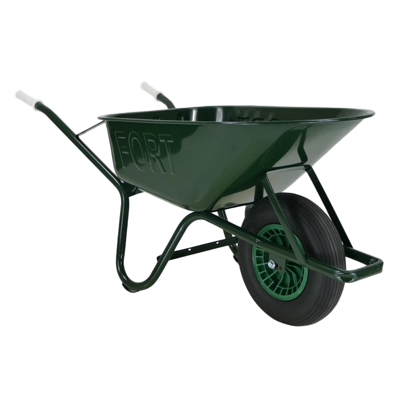 Universele bouwkruiwagen. rondneus model. bak van plaatstaal, naadloos geperst met een ronde neus en dubbel omgelegde rand. onderstel uit ronde stalen buis, uit 1 stuk gebogen inclusief kiepbeugel, kopsteun en bakschoren. aangelaste dwarsversteviging tussen de poten en anti-slijtsloffen aan de poten. onderstel en bak zijn d.m.v. verstevigingssteunen tot 1 geheel samengelast en daarna in milieuvriendelijke groen-blauwe lak op waterbasis gedompeld. geprofileerde kunststof veiligheidshandvatten.