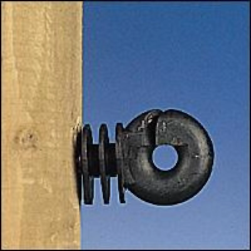 Sterke en zeer solide schroef-ringisolator voor het toevoegen van draad op houten afrasteringspalen. De schroefisolator heeft geen ijzeren kern, waardoor kortsluiting onmogelijk is. De garantie op deze schroefisolator is 2 jaar.