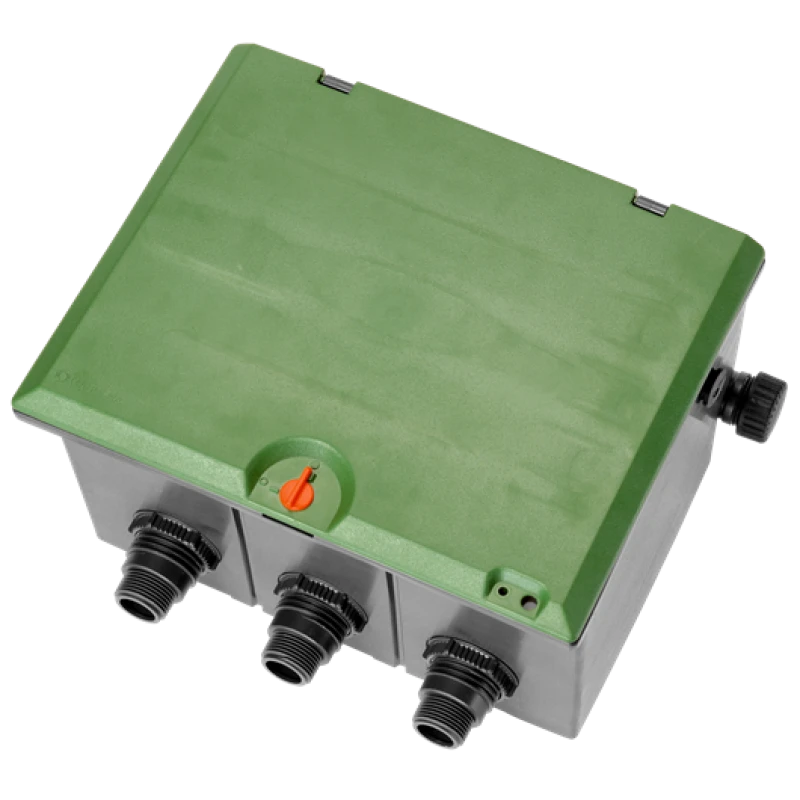 Voor max. 3 beregeningsventielen 9 V of 24 V. Flexibele watertoevoer van 3 kanten naar keuze. Telescoop-schroefverbinding voor eenvoudige ventielmotage/-demontage.