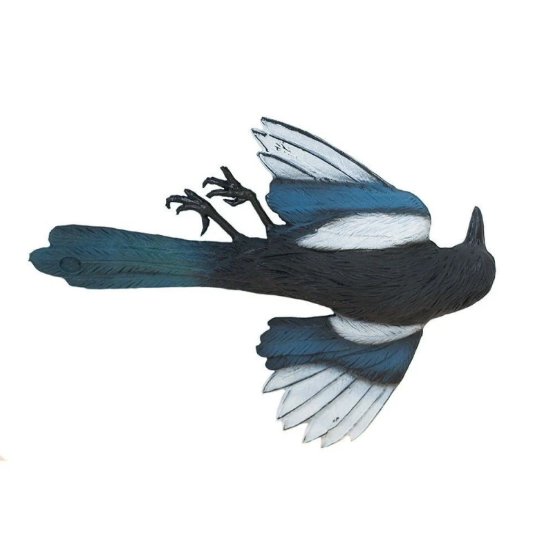Kunststof silhouet van een dode eksterHet waarnemen van een dode vogel, met name wanneer het een soortgenoot betreft, is voldoende aanleiding voor een vogel om op de vlucht te slaan. Dit effect wordt versterkt als hij meerdere dode exemplaren ziet liggen of hangen. Zeker als de naderende vogel kan afleiden dat de dood is veroorzaakt door een van zijn natuurlijke vijanden.Het ophangen van een FlattyMagpie aan een touwtje laat zien dat het mensenwerk betreft. De replica is voorzien van een gaatje voor het touw.Naast de mens zijn roofvogels en andere roofdieren de grootste natuurlijke vijanden van de ekster. Het wegleggen van enkele replica’s is eenvoudig door de relatief platte vorm. Indien u daarbij een replica van een roofvogel of roofdier (zie de beschikbare modellen op deze website) op enkele meters afstand plaatst weet de naderende vogel dat hij niet op deze plek moet zijn.Door het materiaal (gummy) is de FlattyMagpie bestendig tegen alle weersomstandigheden en een val van een grote hoogte. Een duurzaam product waarmee u ongewenste vogels weg kunt houden van daken, balkons, terrassen, moestuinen e.v.a.